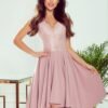 Exclusive asymmetrical dress with longer back, short sleeves, neckline and lace. Dress in powder pink. Skirt with longer back will be perfect for dancing. Polish production. Brand Numoco.