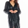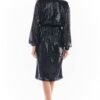 Dress made of sequined fabric. Envelope neckline gives it a feminine character. Envelope bottom of the dress allows to expose legs. Long, wide, flowing sleeves finished with a cuff with elastic band. Elastic waistband provides ideal fit to the figure. Dress was made in Poland