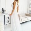 Long dress with a sweetheart neckline and thin shoulder straps. Fitted waist with a long flowy skirt with a slight slit on the leg. The dress comes with a belt of the same color. The model is made of glittering material.
