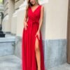Beautiful long dress, extremely graceful, sewn from airy fabric. Top with a delicate neckline, double-layered bottom with a cutout on the leg, adding allure to the creation. A belt is attached to the dress.