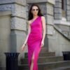 The fitted one-shoulder dress was produced from a fabric that impresses with its quality. The long dress features a wonderful fitted cut with an open shoulder, which combine to create a sensual look. In addition, it features glitter flecks that make a dazzling impression and a leg cutout. It fastens with a covered zipper at the back of the dress. The asymmetrical dress will be perfect for the New Year’s Eve ball as well as for a date with your beloved. The product is made and sewn in Poland.