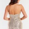Short, fitted dress with thin straps. The neckline is a heart-shaped, and the front of the bottom is decorated with an asymmetrical crease. The dress is fastened with a covered zipper, sewn on an elastic lining. The dress was manufactured in Poland.