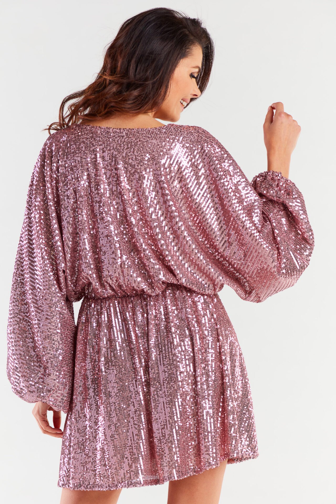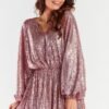 Loose, short dress in one size with wide sleeves, ending in a crease with an elastic band. Cheeky neckline, crinkled at the waist with elastic to fit the figure. The dress is sewn on an elastic lining. The dress is made in Poland.