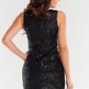 Short, fitted dress with darts, fastened at the back with a covered zipper. The dress has thin straps and a v-neck, sewn on an elastic lining. The dress was manufactured in Poland.