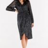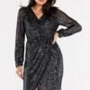 Sequined envelope dress with wider sleeves and a ruffle at the cuff. Wide elastic at the waist for a snug fit. The dress is sewn with elastic lining. The dress is made in Poland.