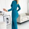 Draped long dress with neckline and long sleeves. Made of stretch fabric with glitter. Sea blue dress. Brand numoco. Polish production.