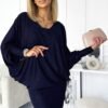 Bat dress with neckline. Made of elastic material with glitter. Dress in navy blue color. Brand numoco. Polish production.