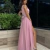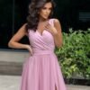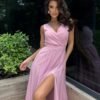 Beautiful long dress, extremely graceful, sewn from airy fabric. Top with a delicate neckline, double-layered bottom with a cutout on the leg, adding allure to the creation. A belt is attached to the dress.