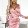 Satin elegant dress with envelope neckline and long sleeves. The dress comes in the color of dirty pink. Made of satin slightly stretchy material (95% polyester, 5% elastane). Fastened at the back with a covered zipper. Brand numoco. Polish production.