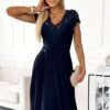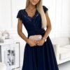 Exclusive chiffon dress with short sleeves, lace neckline and back cutout. Dress in navy blue color. Polish production. Numoco brand.