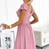 A flared dress with an envelope neckline and short sleeves. Made of stretchy shiny fabric in the color of dirty pink. Brand numoco. Polish product.