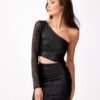 Asymmetrical neckline will beautifully elongate the neck, expose the shoulder and back. Phenomenal cut with a cutout at the waist beautifully emphasizes the silhouette, giving it a feminine shape. The long fitted sleeve and straight bottom finish, will make you feel feminine and sensual in it. Fastening on the side of the dress with a covered zipper. Thanks to the careful finishing, elastic lining and hemmed edges, you can be sure that the sequins will not scratch your skin or pull your tights. The whole makes the model original and eye-catching. Its special asset is the cut-out on the side of the dress at the waist, which reveals a bit of the body in a very subtle way. Interesting form and sequins make this model really unique. Phenomenal mini dress, perfect for special events. The product is made and sewn in Poland.