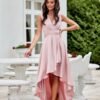 The maxi dress is made of shimmering satin fabric. Its asymmetrical hem and deep neckline add subtle femininity, while its flared cut ensures freedom of movement. The evening dress has a beautiful envelope neckline, which optically lengthens our figure and beautifully emphasizes the bust. Wide tapering at the waist, which will beautifully emphasize the feminine assets. The maxi dress is also characterized by an asymmetrical cut, which allows you to show your legs. The dress is fastened with a covered zipper at the back of the model. The product is manufactured and sewn in Poland.