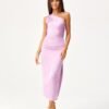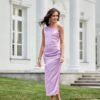 One-shoulder midi dress with a subtle slit at the leg is made of delicate satin fabric. On the side there is a crease, which perfectly conceals any imperfections. A wide shoulder strap with creases on one shoulder gives it a unique character. Fastened with a covered zipper on the side of the dress. This midi dress is not only elegant, but also functional. The midi length gives the dress a refined, feminine style. This dress cut will allow you to feel original by emphasizing your individual style and is sure to attract attention by making you stand out from the crowd regardless of the occasion. The product is made and sewn in Poland.