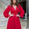 A formal dress with beautiful inserts on the neckline, sleeves and waist. The bottom of the creation is layered, connected to the top with a wide belt. The heart-shaped neckline adds a chic and classy touch to the dress. The dress is fastened with a covered zipper and has a lining. Model suitable for casual parties as well as those more elegant.