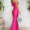 Beautiful satin creation with an unusual one-shoulder top. The bottom is flowing with a slit on the leg. The dress is fastened with a covered zipper and has a lining.
