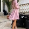 A formal dress with beautiful inserts on the neckline, sleeves and waist. The bottom of the creation is layered, connected to the top with a wide belt. The heart-shaped neckline adds a chic and classy touch to the dress. The dress is fastened with a covered zipper and has a lining. Model suitable for casual parties as well as those more elegant.