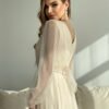 Midi dress with a slightly flared layered skirt trimmed with brocade mesh. The top of the creation is crinkled with long sleeves finished with elastic. The sleeves are sewn from the same mesh as the rest of the dress. The neckline and back in the shape of a cheese. The dress is fastened with a covered zipper and has a lining. Model adding chic and femininity.