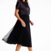 A midi length, short-sleeved dress with a kimono cut and an elastic waistband. The top of the dress is made of satin, and the bottom is made of shiny mesh with a lining.