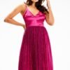Midi dress with a fitted, satin strapless top that perfectly emphasizes the feminine curves. The flared bottom was made of shiny mesh on a lining.