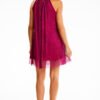 Short dress with a stand-up collar made of fine and shiny mesh and satin lining. It is a light, airy cut that will hide the flaws of beauty.