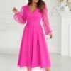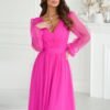 Midi dress with a slightly flared layered skirt trimmed with brocade mesh. The top of the creation is crinkled with long sleeves finished with elastic. The sleeves are sewn from the same mesh as the rest of the dress. Cheese-shaped neckline and back. Model adding chic and femininity. The dress is fastened with a covered zipper and has a lining. Available in a variety of colors.