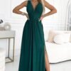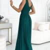 Long gown with neckline, leg slit and three-stitched waist. Made of stretch fabric with brocade in green color. Ideal for weddings, christenings and other major events. Polish product. Numoco brand.