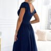 A blushed dress with an envelope neckline and short sleeves. Made of stretchy shiny fabric in navy blue color. Brand numoco. Polish product.