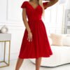 A flared dress with an envelope neckline and short sleeves. Made of stretchy shiny fabric in red color. Brand numoco. Polish product.