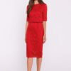 Elegant pencil dress with two layers, which combines a classic smooth fabric on the bottom with a delicate lace outer layer, creating a chic and feminine look. The dress is cut off at the waist, which emphasizes the waist and adds proportion to the figure. Short lace sleeves add lightness and subtle charm. The below-the-knee length and the slit at the back ensure comfort and freedom of movement, while emphasizing the elegant character of the styling. A covered zipper at the back allows for a discreet adjustment to the figure. The dress was designed and sewn in Poland, guaranteeing the highest quality workmanship and attention to detail. Ideal for special occasions when you want to look elegant and classy.