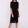 Elegant pencil dress with two layers, which combines a classic smooth fabric on the bottom with a delicate lace outer layer, creating a chic and feminine look. The dress is cut off at the waist, which emphasizes the waist and adds proportion to the figure. Short lace sleeves add lightness and subtle charm. The below-the-knee length and the slit at the back ensure comfort and freedom of movement, while emphasizing the elegant character of the styling. A covered zipper at the back allows for a discreet adjustment to the figure. The dress was designed and sewn in Poland, guaranteeing the highest quality workmanship and attention to detail. Ideal for special occasions when you want to look elegant and classy.