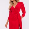 Elegant velour knit dress that combines comfort with sophisticated style. The top of the dress has an envelope cut, subtly emphasizing the neckline, and a decorative sash that adds a chic touch. The knee-length pencil bottom emphasizes the feminine silhouette, and there is a high slit at the back, giving the creation sensuality. The dress has 7/8 length sleeves, with a delicate crease on the shoulders and an overlap, which gives the whole an elegant expression. Partially lined, with a concealed zipper on the side, providing a discreet closure. Designed and sewn in Poland, it is the perfect choice for special occasions.