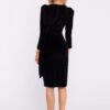 Elegant velour knit dress that combines comfort with sophisticated style. The top of the dress has an envelope cut, subtly emphasizing the neckline, and a decorative sash that adds a chic touch. The knee-length pencil bottom emphasizes the feminine silhouette, and there is a high slit at the back, giving the creation sensuality. The dress has 7/8 length sleeves, with a delicate crease on the shoulders and an overlap, which gives the whole an elegant expression. Partially lined, with a concealed zipper on the side, providing a discreet closure. Designed and sewn in Poland, it is the perfect choice for special occasions.