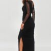 The extraordinary black dress that exudes elegance and sophistication. The model has a fitted cut that emphasizes the figure. Ruching on the sides adds texture and accentuates the waist and hips, while masking imperfections of the silhouette. The dress has long, sheer mesh sleeves that create a subtle contrast with the opaque bodice of the dress, contributing to its elegant and modern look. The neckline is a combination of sheer fabric and a V-shaped neckline, adding a sensual character to the design. Additionally, there are striking shoulder pads that emphasize the shoulder line. An elegant addition is the gold button placed at the back of the dress, which makes it easy to put on the outfit. The dress reaches the ankles and has a flirtatious slit, allowing freedom of movement and adding a touch of finesse. The model is perfect for formal occasions or evening outings, balancing sophistication with a hint of boldness.