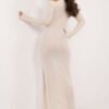 Elegant evening dress with a pencil cut, perfect for formal outings and events. Made of high-quality material with the addition of polyester and viscose, with a delicately varied texture, which gives the creation a chic look. The maxi length and fitted silhouette subtly emphasize the feminine figure. The asymmetrical neckline and shoulder pads sewn in give the dress a distinctive character, while the long sleeves with cuffs featuring a thumbhole provide a modern, intriguing look. Additional creases on the fabric add elegance, creating a unique unbuttoned style.