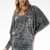Kimono sequin mini dress with long sleeves. Elegant sequin velour mini dress with kimono cut, ideal for special occasions such as holidays, family celebrations or dinners. A combination of elegance and comfort that emphasizes the assets of the figure. Kimono sleeves provide comfort and freedom of movement, while the boat neckline subtly exposes the shoulders. The mini cut effectively covers up the shortcomings of the figure, while exposing the legs. Sequins add sparkle, making the dress an ideal choice for evening outings.