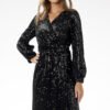 Envelope sequin midi dress with long sleeves Delightful midi dress sewn from sequin velour, which emphasizes the feminine silhouette and adds glamour to any occasion. Perfect for holidays, celebrations and family gatherings. The elastic waistband ensures a comfortable fit and the dress fits beautifully on the body. Sequins reflect light, giving a luxurious shine. The lining guarantees comfortable wear for long hours. It is a perfect choice for evening parties and formal dinners.
