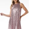 Evening sequin trapeze mini dress with halter neckline. The dazzling evening mini dress with sequins and a halter neckline from the Polish brand Awama is the perfect choice for special occasions such as holidays, New Year’s Eve, or elegant parties. This dress combines a loose trapeze silhouette with sparkling sequins, which give it a unique shine. The halter neckline beautifully accentuates the shoulders, adding sensuality and elegance. The dress has a lining, which increases comfort when wearing. An exceptional proposal for any occasion where you want to shine and feel special.