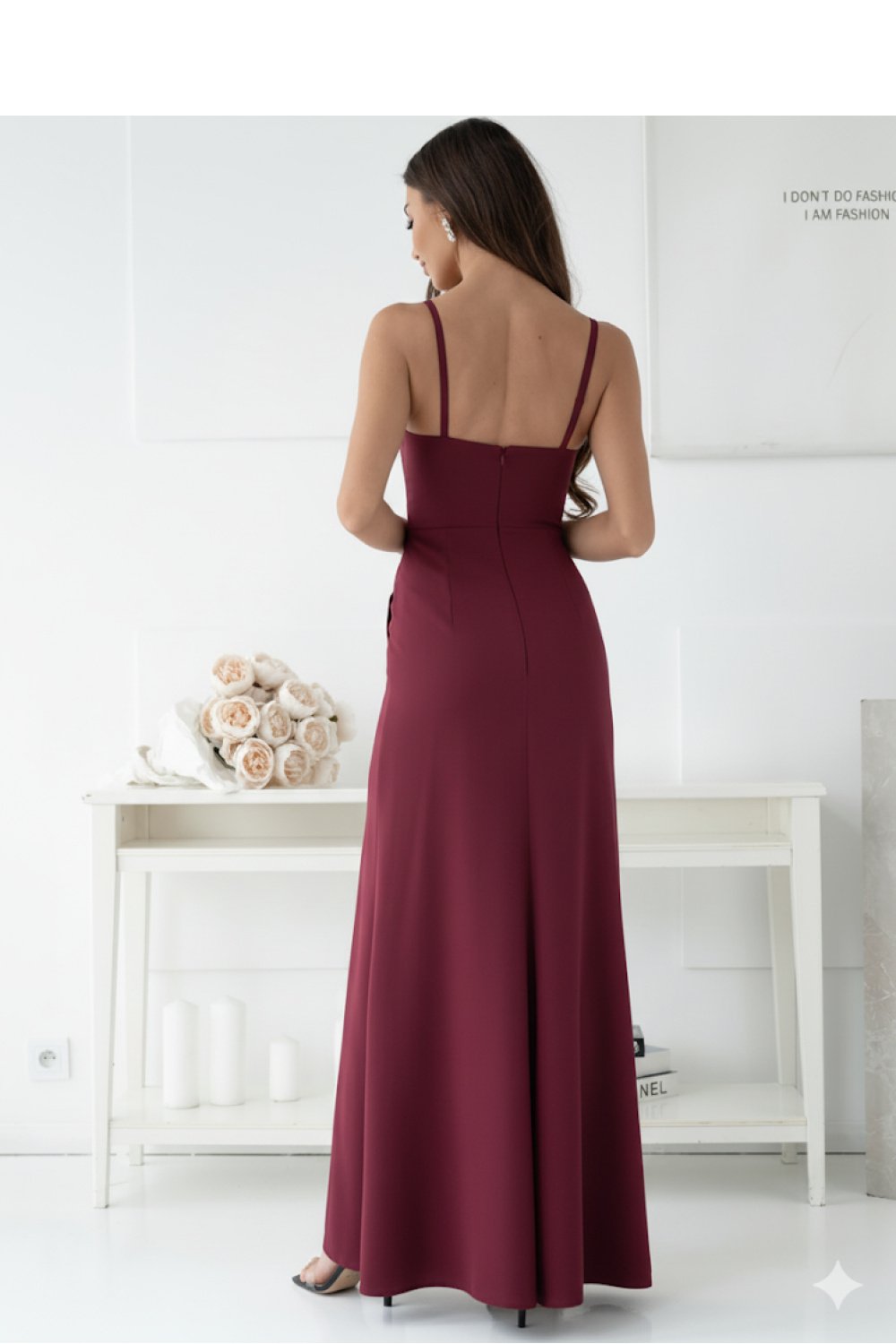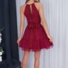 Elegant tulle dress with straps and adjustable tying. The dress fastens with a covered zipper. Decorative belt for tying at the waist. Slightly flared bottom.