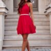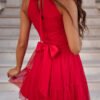 Elegant tulle dress with straps and adjustable tie. The dress fastens with a concealed zipper. There is a decorative belt for tying at the waist. The bottom is slightly flared.