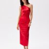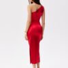 Satin midi dress with one shoulder. The top is asymmetric with gathering on the shoulder, and the bottom is straight, with a slit on the leg. It does not have a lining and is fastened with a zipper.