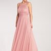 Elegant maxi dress made of light, flowing material. The top subtly ruched with wide straps and a high neckline. Model with a fitted, ruched waistband.