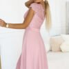The enchanting, feminine dress with a lace top and flared bottom is a perfect choice for weddings, receptions, and special occasions. The top made of delicate lace with short sleeves beautifully emphasizes the neckline, while the bottom made of flowing fabric subtly accentuates the waist and adds lightness to the entire outfit. The romantic color of powdery pink enhances the beauty and adds charm to every woman. The dress will work perfectly as an outfit for a wedding, communion, date, or elegant outing.