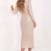Evening dress in a pencil silhouette, which emphasizes the female figure and combines elegance with a modern accent. Made of high-quality viscose with a polyester blend, it looks extremely chic, while also guaranteeing comfort when worn. The smooth fabric beautifully drapes on the body, and the midi length adds a touch of class. The model stands out with padded shoulders, which give the silhouette distinctive proportions. The wrap neckline subtly emphasizes the neckline and collarbone, and the ruching on the front with a decorative metal buckle attracts attention and accentuates the waist. The dress has no fastening, which ensures ease and comfort when putting it on. Perfect for formal occasions or parties, it allows you to create a look that will impress with elegance and feminine charm.