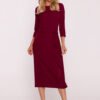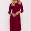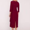 Elegant cocktail dress with ruffle is a proposal for women who appreciate subtle classics with a touch of modernity. Made of smooth fabric with a delicate, noble sheen, it looks beautiful in motion and will work perfectly for special occasions. The model has a semi-round neckline and 3/4 length sleeves, which add a balanced elegance to it. The silhouette has been slightly fitted, so the dress emphasizes the figure while maintaining comfort. The waist is subtly marked with a material overlay, which visually slims and gives the whole a harmonious shape. The straight bottom has been embellished with a decorative ruffle running along the side of the skirt, an impressive detail that introduces a light, feminine accent. At the back, there is a high slit and a concealed zipper for easy dressing. Designed and sewn in Poland with attention to the highest quality of workmanship.