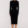Classic and sensual velvet midi dress that combines elegance with timeless simplicity. Made of soft, pleasant to the touch velvet fabric, beautifully reflects the light, creating a subtle, luxurious shine. The model enchants with a deep sweetheart neckline, which emphasizes the feminine silhouette and adds elegance to the whole look. Long, straight sleeves bring balance to the silhouette, giving it an elegant and well-balanced character. The dress has a fitted pencil shape, with a clearly defined waist and knee-length, which visually slims the figure and makes it perfect for both evening stylizations and special occasions. The model does not have pockets or lining, which maintains lightness and flexibility. The concealed zipper at the back makes it easy to put on and ensures a perfect fit. The dress is designed and made in Poland with attention to every detail, the perfect choice for women who appreciate classic elegance and comfort.