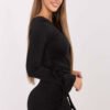 Elegant mini cocktail dress with a pencil silhouette, perfect for formal occasions and parties. Made of a dominant blend of polyester, viscose, and elastane, it fits the silhouette perfectly, emphasizing its shape while providing comfort. The model is kept in a smooth pattern, giving it class and modern simplicity. The dress has a round neckline and long sleeves, finished with fancy ruffles with a decorative rose made of the same material, which adds a unique, feminine character to the whole. At the front, from the waist down, there is a delicate gathering that subtly shapes the silhouette and creates an elegant effect. The bottom of the dress is decorated with a ruffle, giving the outfit lightness and cocktail charm. The model has no closure, so it naturally falls and is easy to put on. It is an ideal choice for women looking for an elegant, feminine, and eye-catching dress for special occasions.