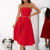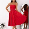 An elegant strapless dress is a proposal that combines a classic form with eye-catching details. The model is fastened with a hidden zipper placed on the left side, which ensures easy putting on and a neat finish. The waist is emphasized by a decorative sequin belt, which adds shine and a unique character to the whole. The flared bottom beautifully falls in motion, giving the silhouette lightness and girlish charm. On the back, there is a practical lacing that allows for adjusting the fit. Additionally, the dress has sewn-in ribbons that allow for attaching straps according to your own needs (straps are not included). It is an ideal choice for ceremonies, receptions, and special occasions.