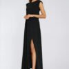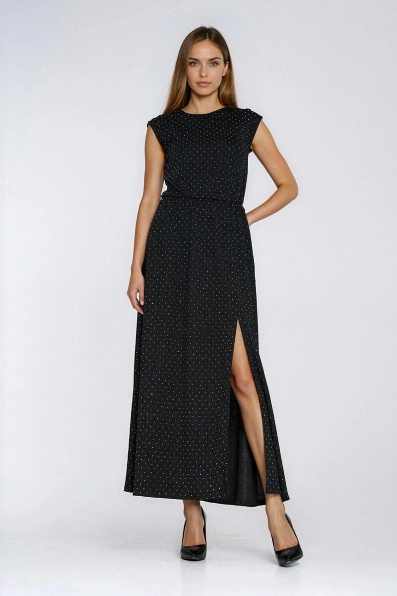 An impressive dress with a fitted fit, made of soft fabric decorated with subtly shimmering jet beads, which give the whole a unique shine. The model with a round neckline and sleeveless looks modern and elegant. The maxi length visually elongates the silhouette, and the elastic waistband beautifully accentuates the waist and ensures comfort. The dress is put on over the head, which increases user comfort. The back attracts attention with a wrap top with a striking cutout on the back, adding a sensual character to the whole. The front slit on the leg emphasizes femininity and freedom of movement. An ideal proposal for evening outings, receptions, and special occasions.