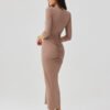 The fitted midi dress with an eye-catching ruching along the entire length subtly shapes the silhouette and emphasizes its assets. The wrap neckline and 3/4 sleeves give it an elegant, feminine character, while the shoulder pads delicately accentuate the shoulder line, adding clarity to the overall look. The model was sewn in Poland with attention to every detail and comfort of wearing, making it perfect for both premium collections and everyday stylizations. It pairs well with classic heels and jewelry for a party, date, or elegant meeting, but also looks equally impressive with minimalist accessories for an evening out.
